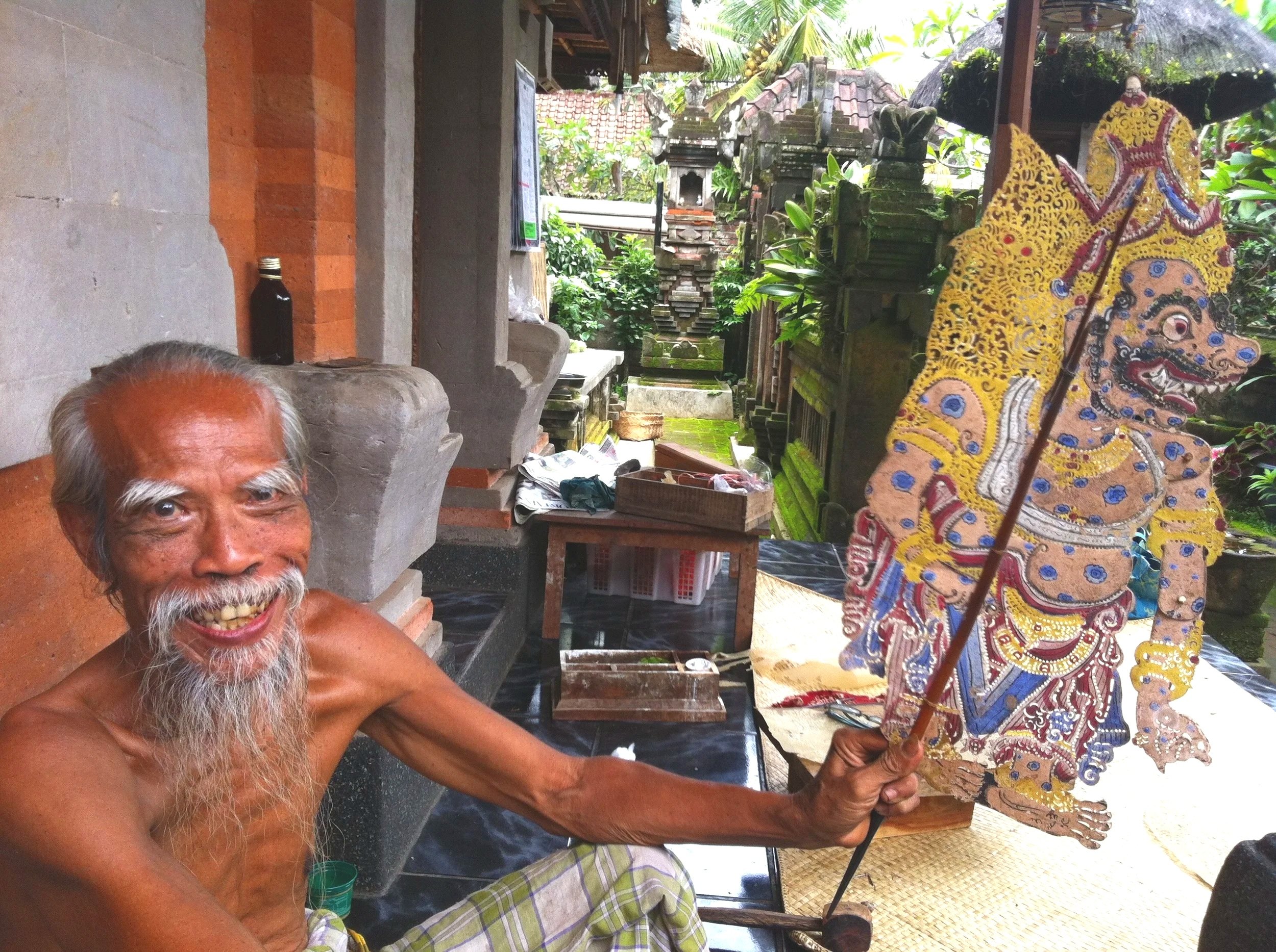 Ida Bagus with one of his intricately hand-carved Balinese puppet creations →